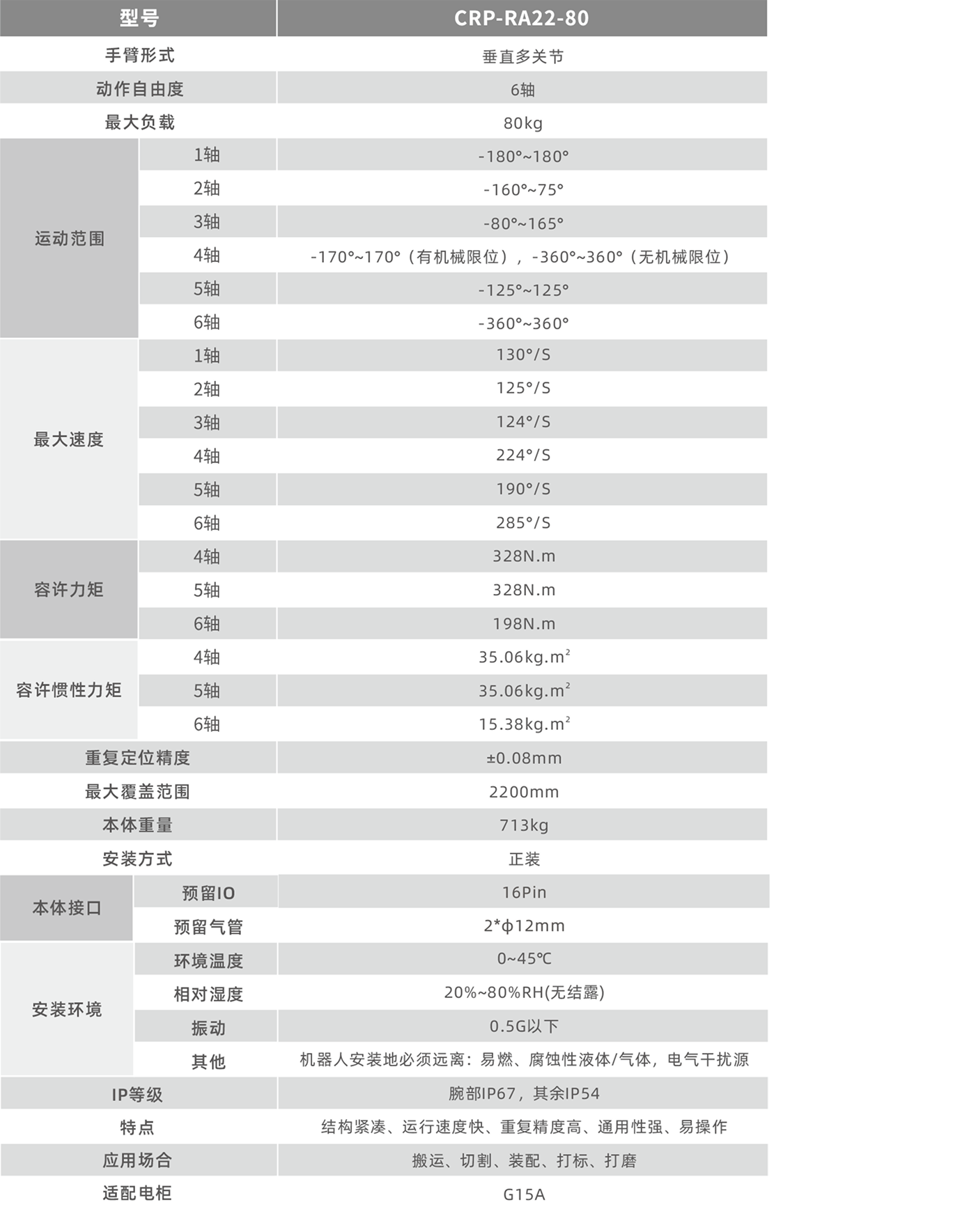 内置电缆、气管,通过小臂和手腕中心处设置中空部分,从机器人基部到腕部末端内置电缆和气管,更大地方便了用户使用,提高了作业效率。